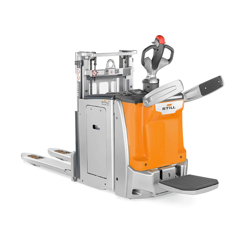 Diseñada para ofrecer confort en trayectos prolongados, la EXD-SF cuenta con una plataforma de conducción abatible con suspensión neumática, que reduce la fatiga del operador. Los brazos laterales, también abatibles y regulables en altura, proporcionan estabilidad adicional incluso a velocidades de hasta 9 km/h. Además, su manejo con una sola mano, la excelente tracción, el control de velocidad intuitivo y la dirección eléctrica suave garantizan una experiencia de conducción segura, precisa y ergonómica.