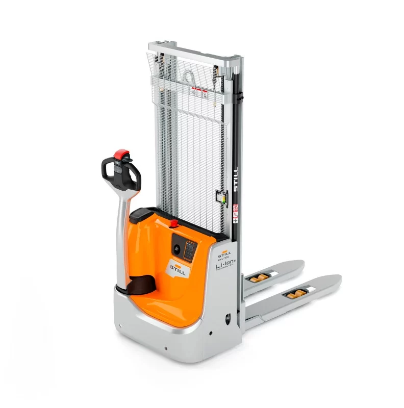 Este modelo también impresiona por su estabilidad en pendientes y su sistema de parada automática al soltar el timón, lo que incrementa significativamente la seguridad. La función de amortiguación de descenso protege la carga al reducir suavemente la velocidad justo antes de tocar el suelo. Gracias a su excelente capacidad de carga residual y maniobrabilidad, el EXV permite almacenar mercancías de forma más compacta y recuperarlas con facilidad, convirtiéndolo en una solución ideal para mover grandes volúmenes en espacios estrechos, tanto en zonas de almacenamiento previo como en estanterías.