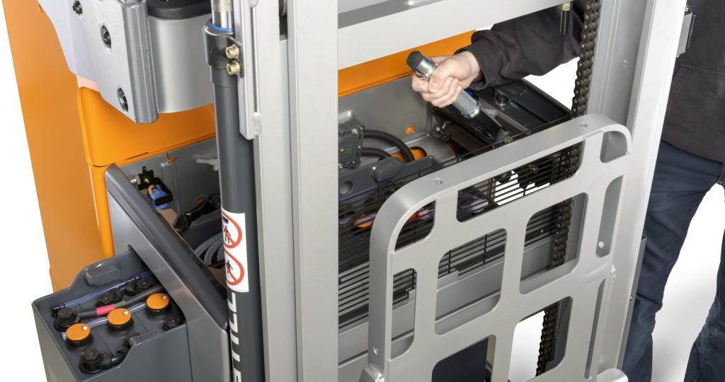 - Potencia para turnos prolongados: batería con capacidad de hasta 625 Ah y cambio lateral rápido de batería.