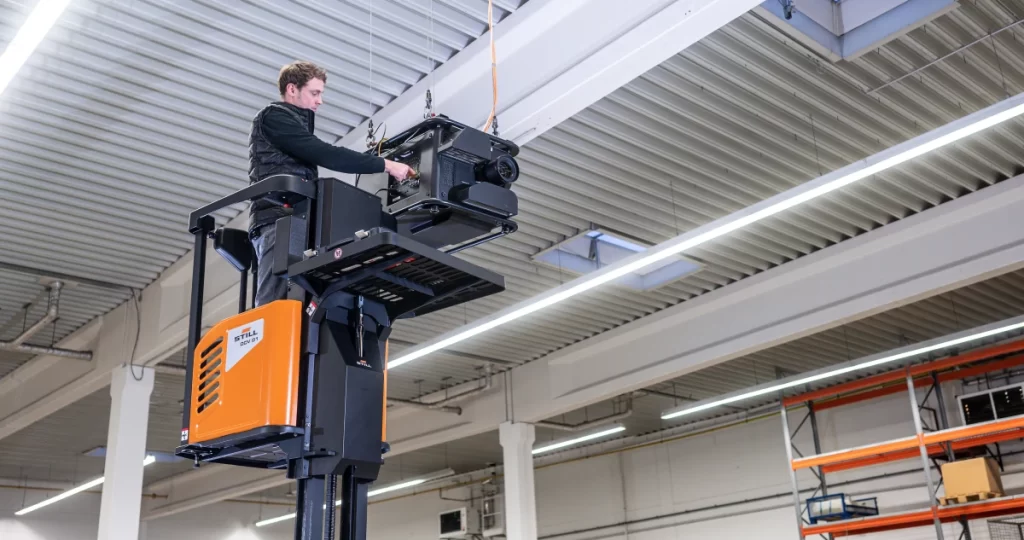 Siempre disponible cuando se necesita, la OCV incorpora de serie una batería de litio de carga rápida y su cargador correspondiente. Por seguridad, las puertas de la plataforma del operario se bloquean automáticamente al iniciar el ascenso. Además, el sistema STILL Safety Light, también incluido de serie, proyecta un haz azul en el suelo para alertar a otros trabajadores de su presencia.
