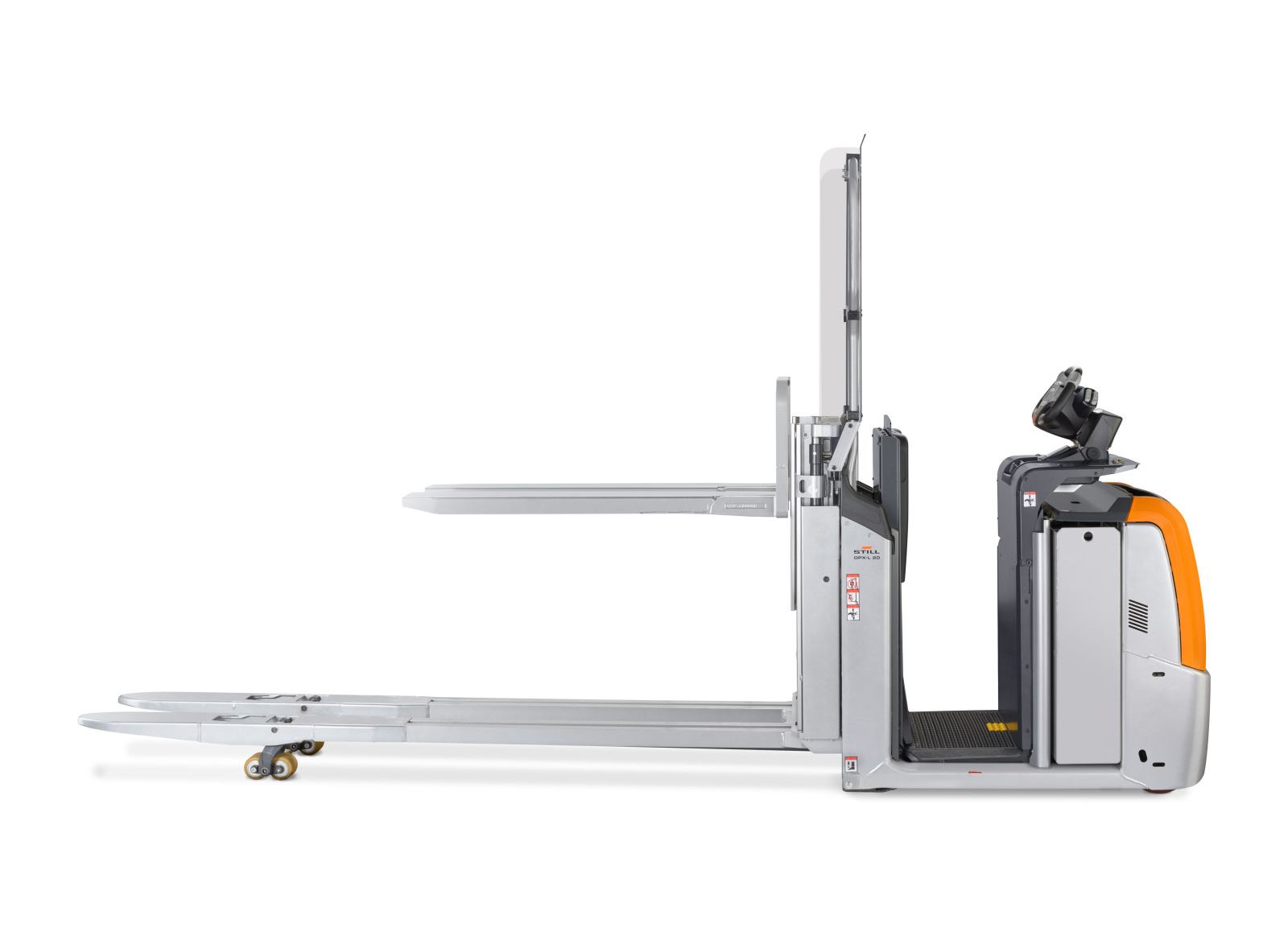 Una vez lleno el primer palet, se baja hasta el suelo y el vehículo se avanza ligeramente hasta que el palet alcanza el extremo de la horquilla. En ese momento, se despliega el segundo palet para ocupar el espacio libre y seguir trabajando sin pausas. Además, su altura de trabajo ajustable hasta 891 mm favorece una preparación ergonómica y cómoda de hasta 2000 kg. Gracias al centro de gravedad bajo, la OPX-L 20 garantiza una conducción estable y segura, incluso en trayectos curvos.